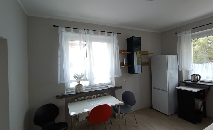 Wyposażenie kuchni | garnki, kuchenka gazowa, lodówka, naczynia, piekarnik, stała zabudowa, stół, wyposażenie drobne, zlewozmywak z baterią |