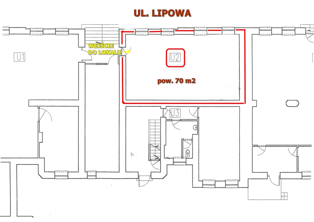 Lokal o powierzchni 70 m2 składa się z dużej sali sprzedażowej, pomieszczenia socjalnego, i łazienki z wc.