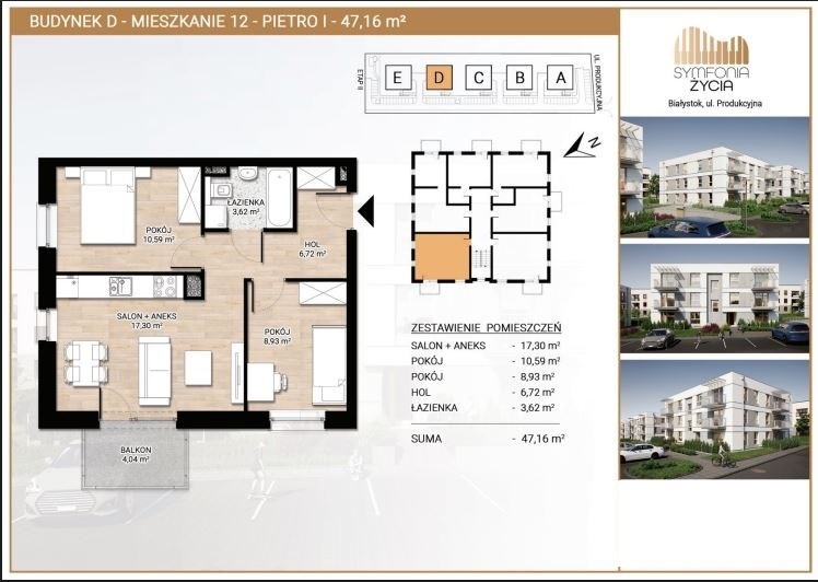 Oferujemy mieszkanie 3- pokojowe nr A12 o powierzchni 47,16m2 zlokalizowane na I piętrze w kameralnym budynku realizowanym w ramach inwestycji deweloperskiej "Symfonia Życia " przy ulicy Produkcyjnej w Białymstoku.