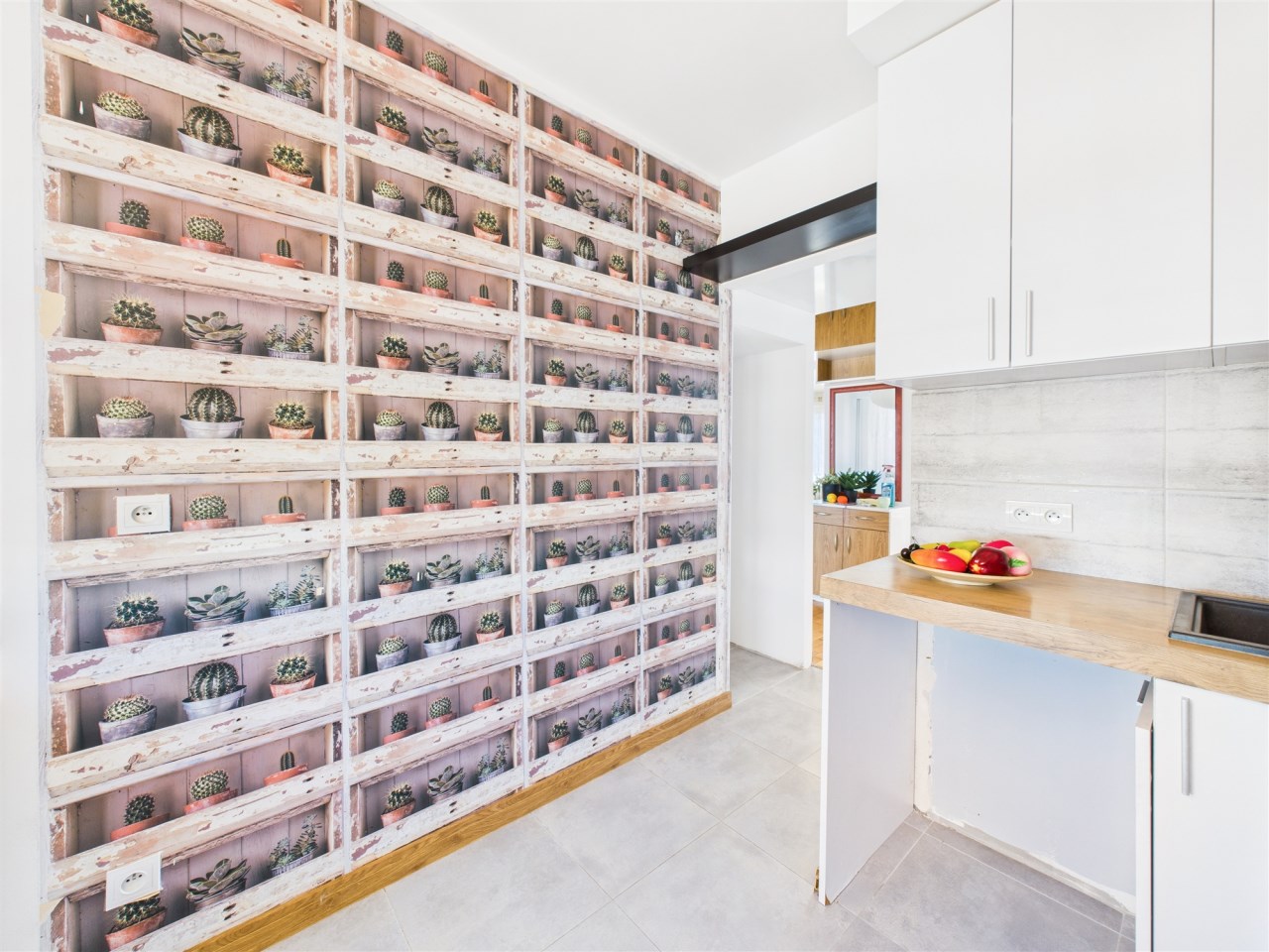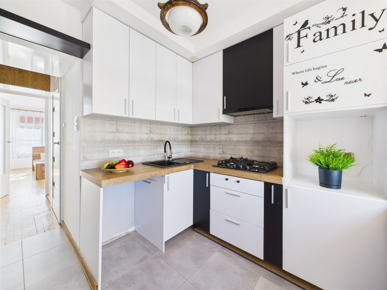 Kuchnia (6 m²) – widna i funkcjonalna, z zabudową meblową i miejscem na piekarnik oraz zmywarkę. W przejściu wyodrębniono miejsce na ustawienie lodówko-zamrażarki tak, aby nie ograniczać przestrzeni w samej kuchni.