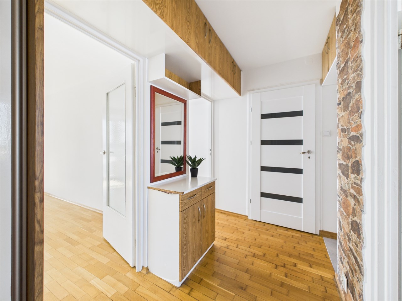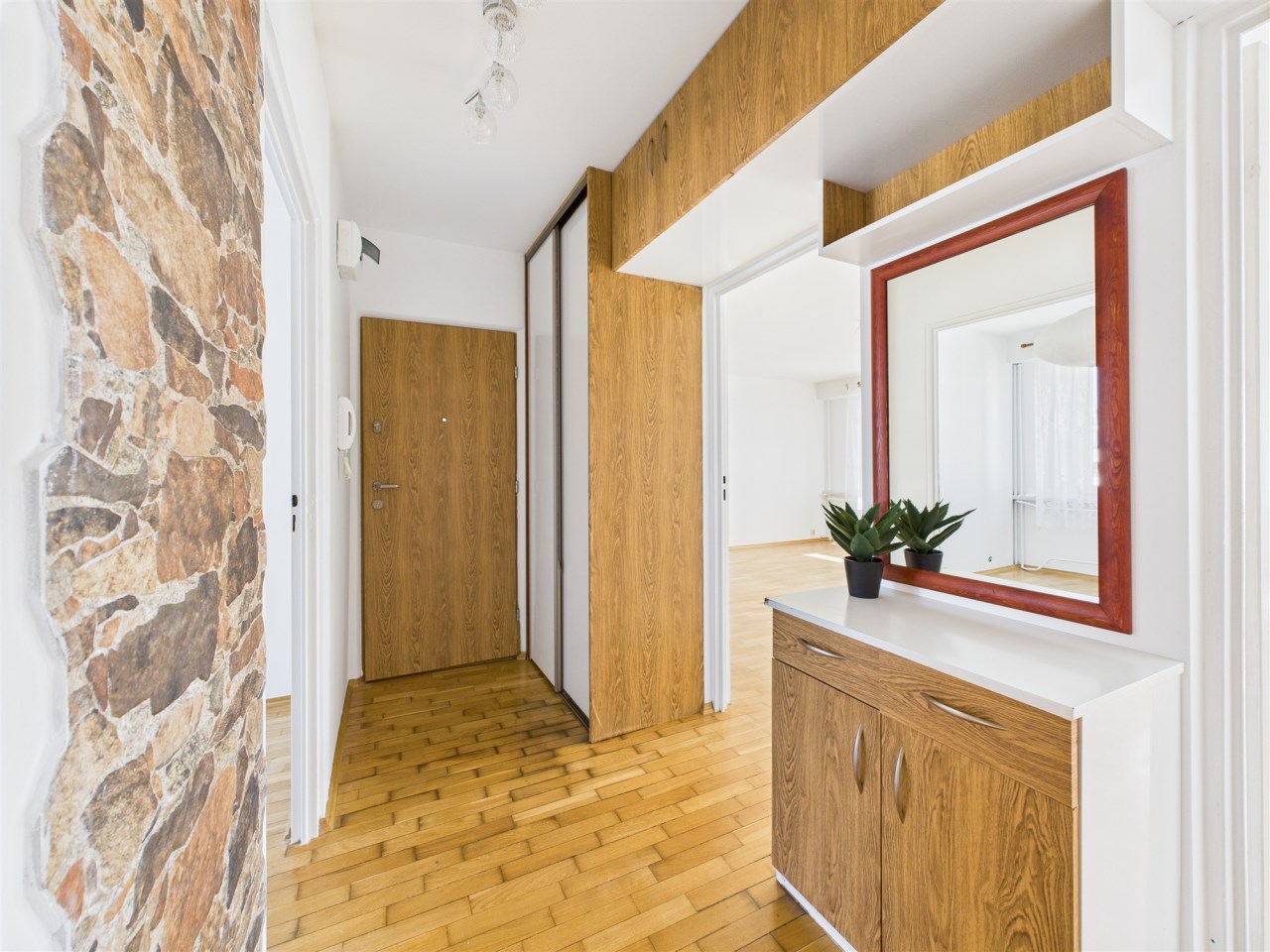Przedpokój (6 m²) – wyposażony w dwudrzwiową szafę z przesuwnymi drzwiami oraz szafki podsufitowe, tak, by wszystko miało swoje miejsce i porządek.
