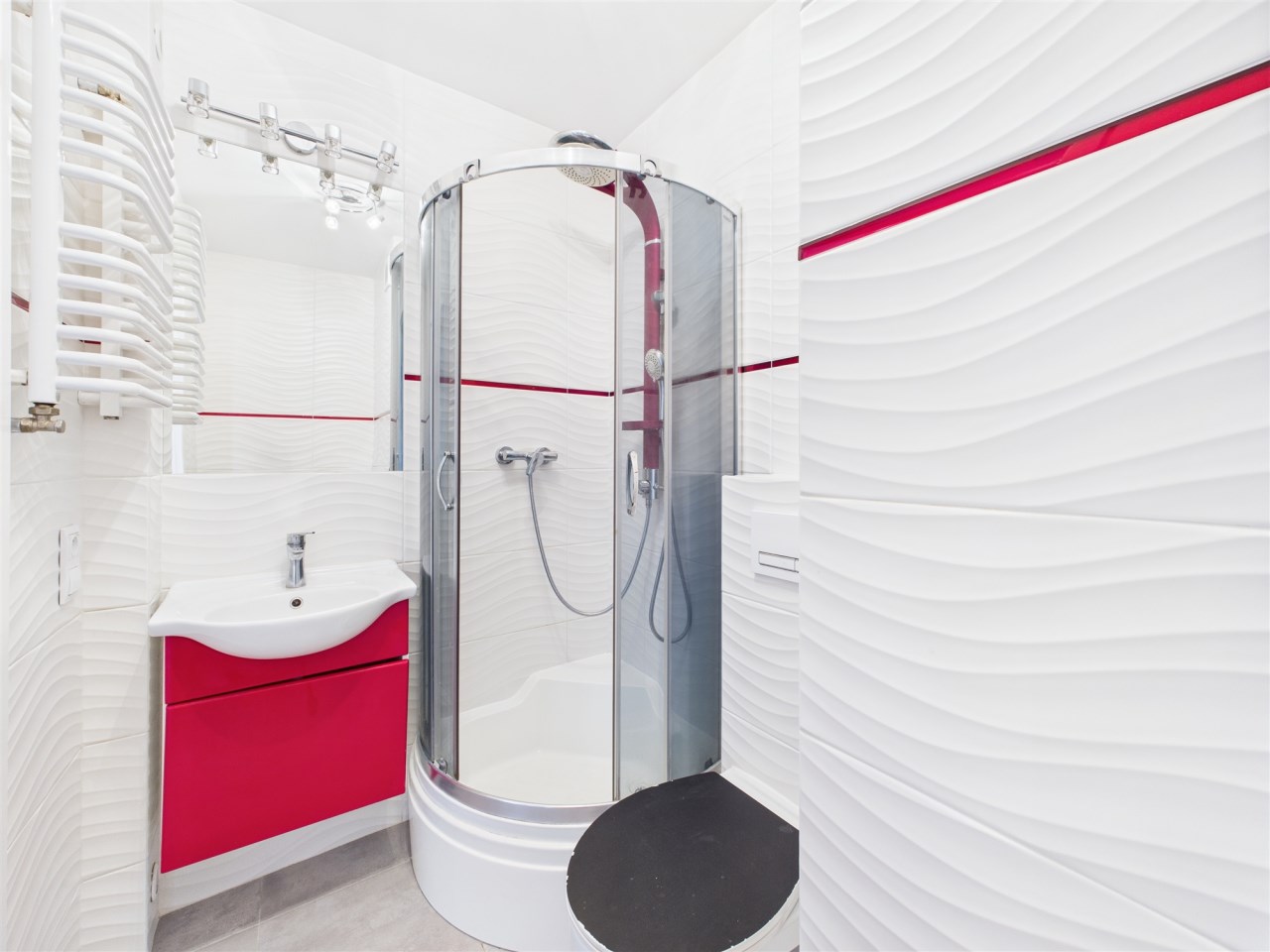 Łazienka (3 m²) – z kabiną prysznicową, umywalką, WC oraz miejscem na pralkę.