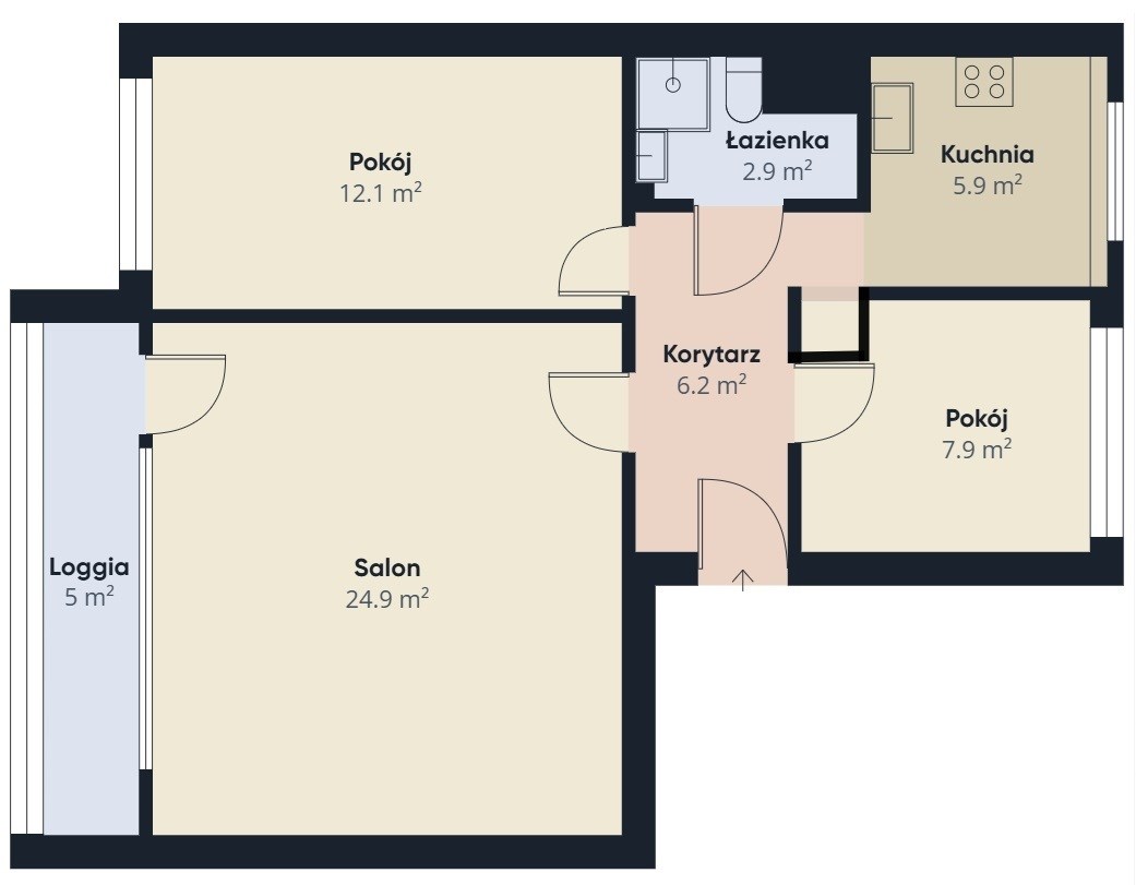 3. Funkcjonalny rozkład: Przemyślany układ mieszkania pozwala na dostosowanie przestrzeni do Twoich potrzeb. Trzy niezależne pokoje, z przestronnym salonem, dwiema sypialniami i oddzielną kuchnią. Dodatkowo z salonu masz wyjście na zabudowaną 5m2 loggię.