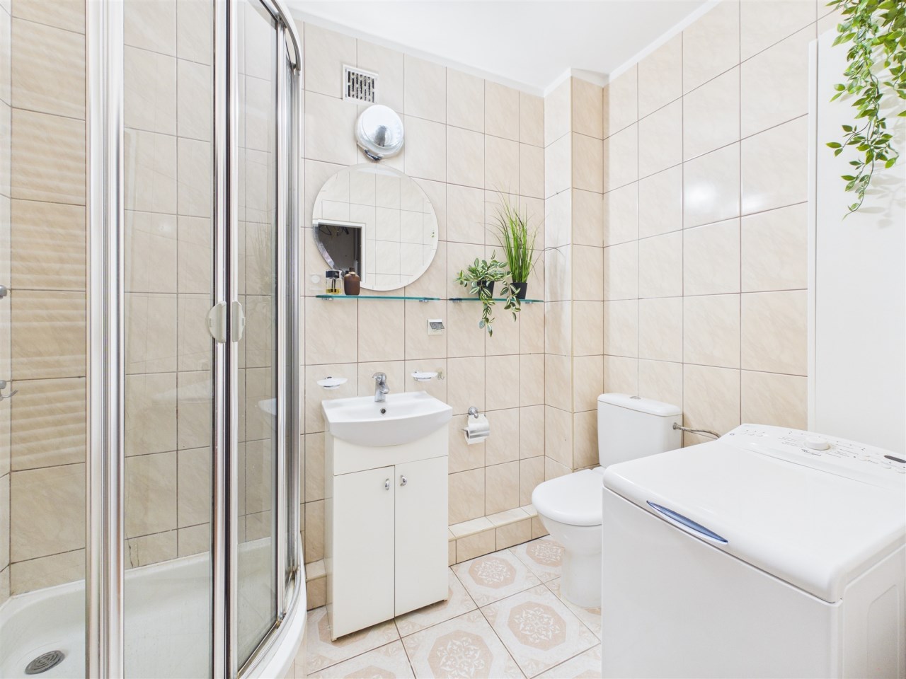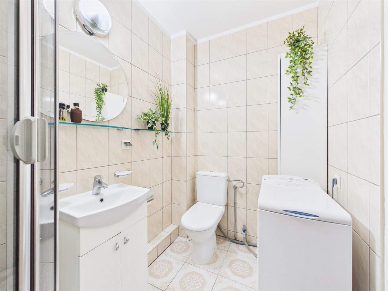 Łazienka: Kompaktowa i przemyślana – z prysznicem, WC oraz wygospodarowanym miejscem na pralkę i szafkę.