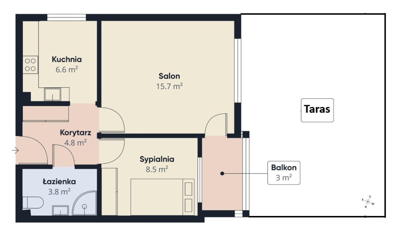 Salon: Przestronny i jasny, z bezpośrednim wyjściem na balkon i Twój prywatny taras.
