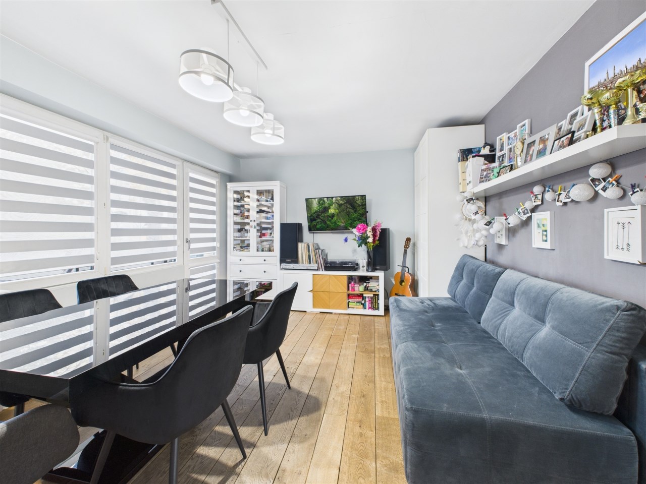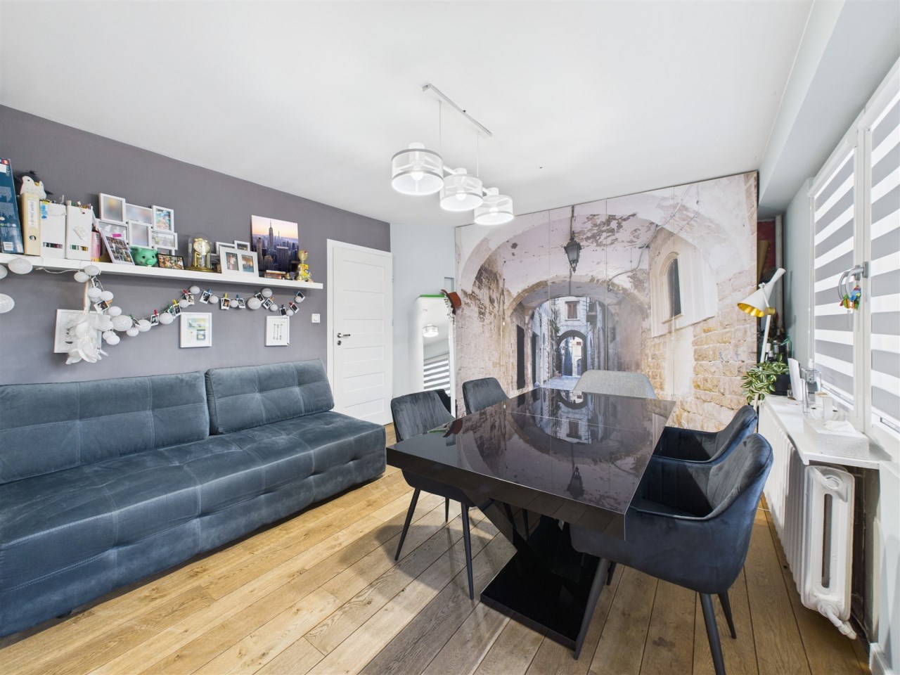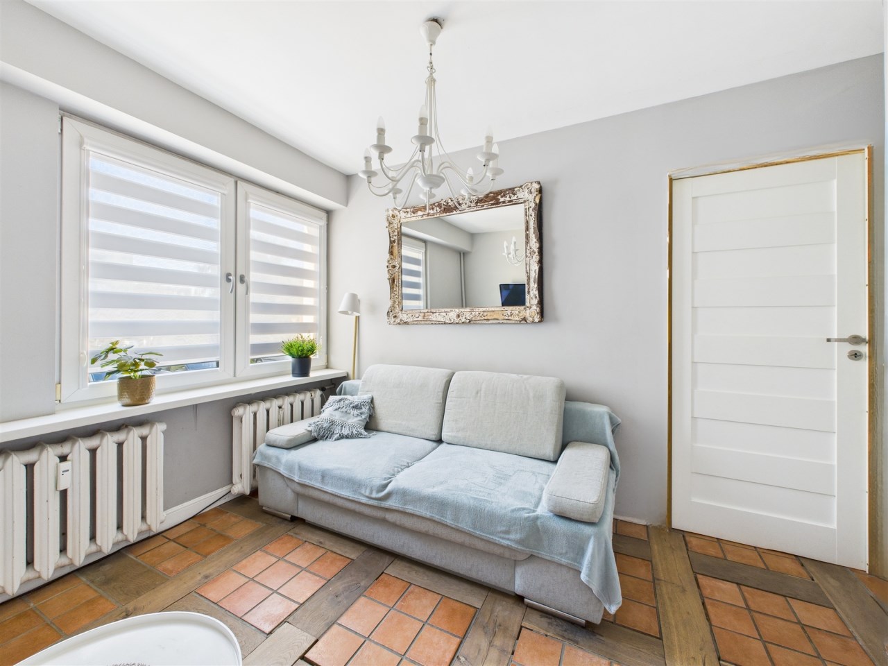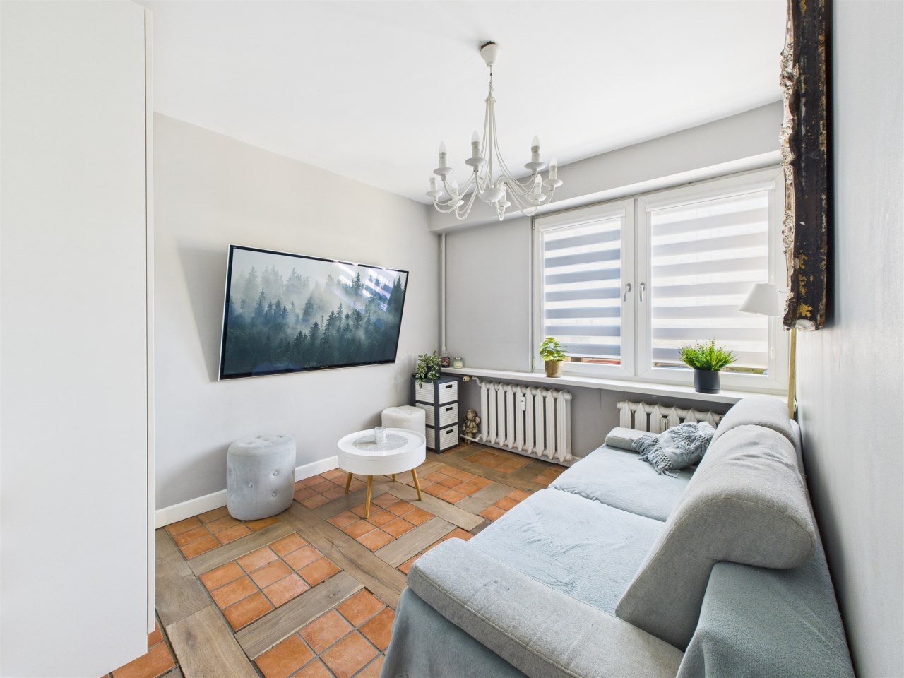 W przestronnym salonie, gdzie podłoga wyłożona jest pięknymi dębowymi deskami, swobodnie mieści się rozkładany stół i wygodna kanapa. Funkcjonalność łączy się tu ze stylem – za fototapetą przedstawiającą urokliwą uliczkę, ukryto pojemną szafę, maksymalizując miejsce do przechowywania. Jedna z sypialni również posiada szafę na całą szerokość pokoju, gwarantując ład i porządek. Druga sypialnia (gościnna) pełni obenie funkcję saloniku telewizyjnego.