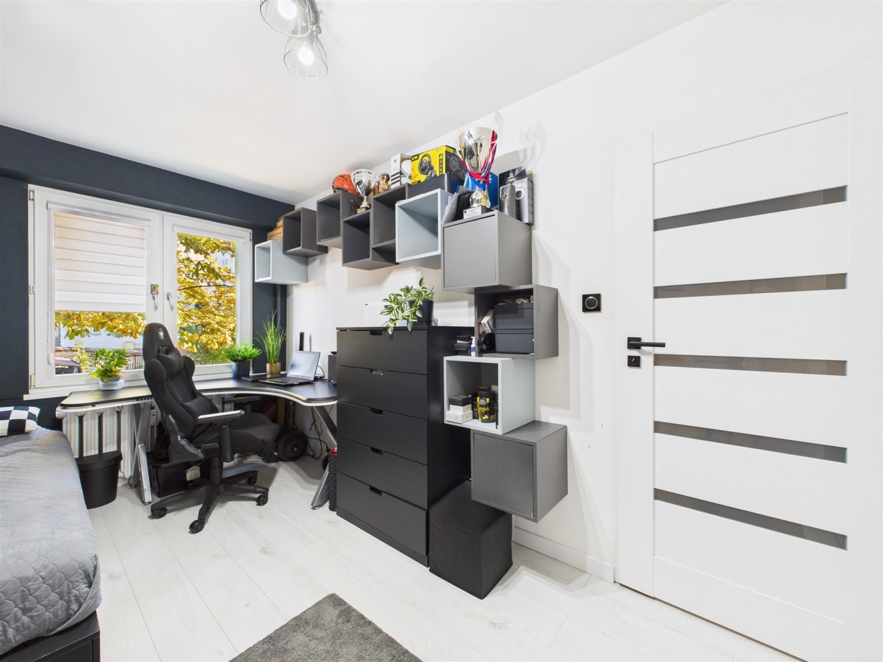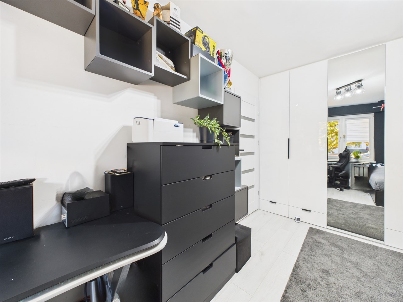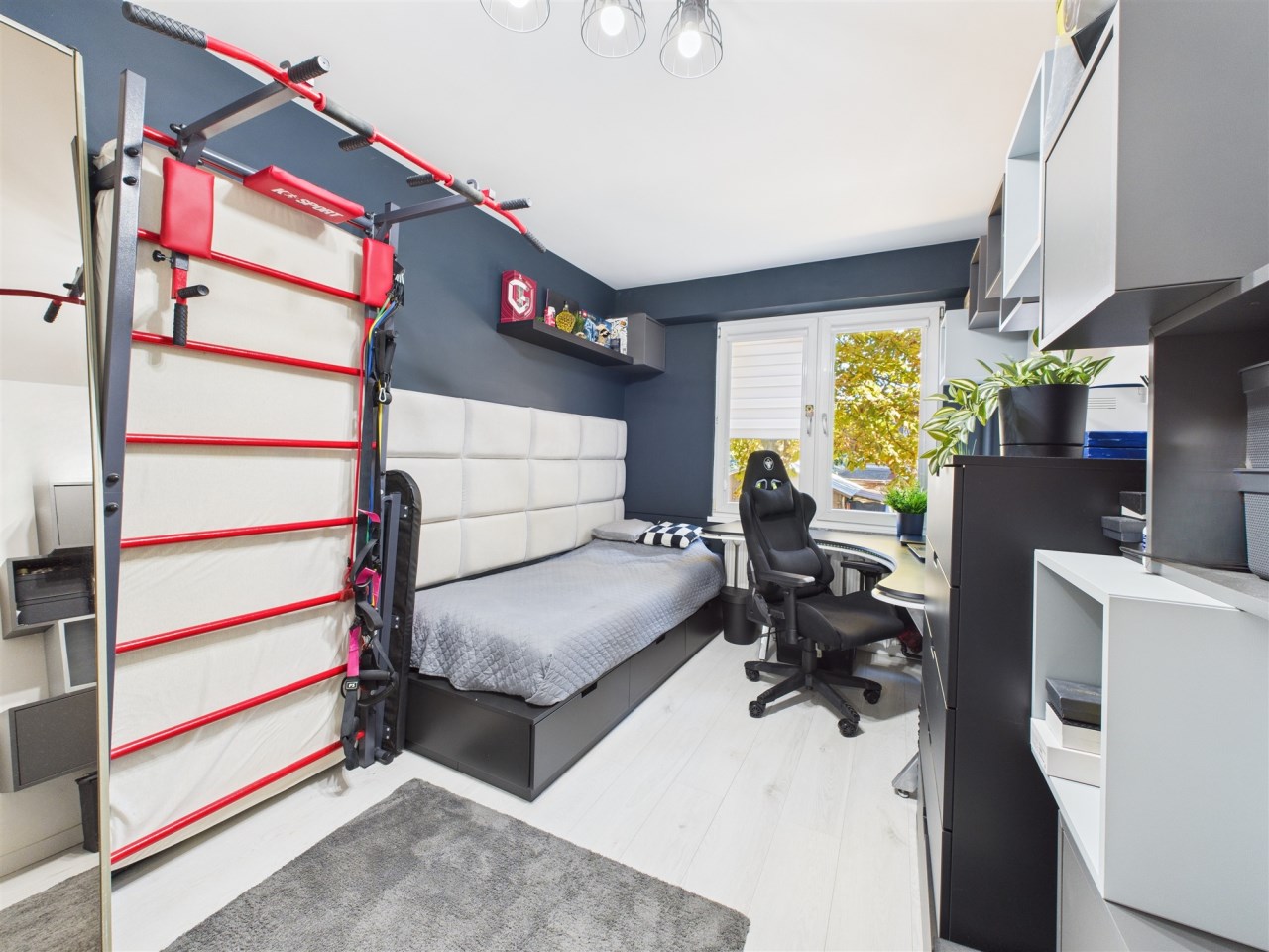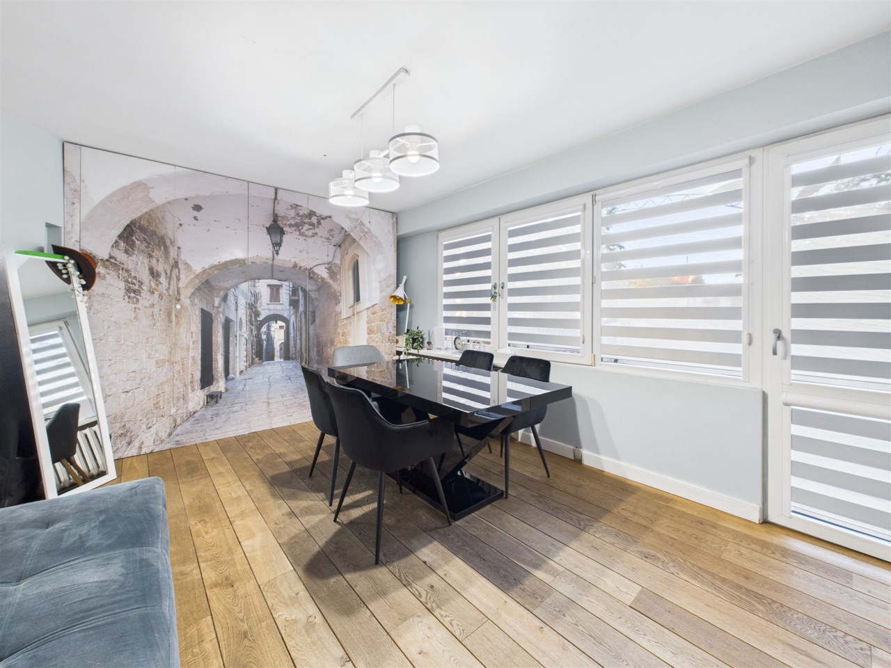 W przestronnym salonie, gdzie podłoga wyłożona jest pięknymi dębowymi deskami, swobodnie mieści się rozkładany stół i wygodna kanapa. Funkcjonalność łączy się tu ze stylem – za fototapetą przedstawiającą urokliwą uliczkę, ukryto pojemną szafę, maksymalizując miejsce do przechowywania. Jedna z sypialni również posiada szafę na całą szerokość pokoju, gwarantując ład i porządek. Druga sypialnia (gościnna) pełni obenie funkcję saloniku telewizyjnego.