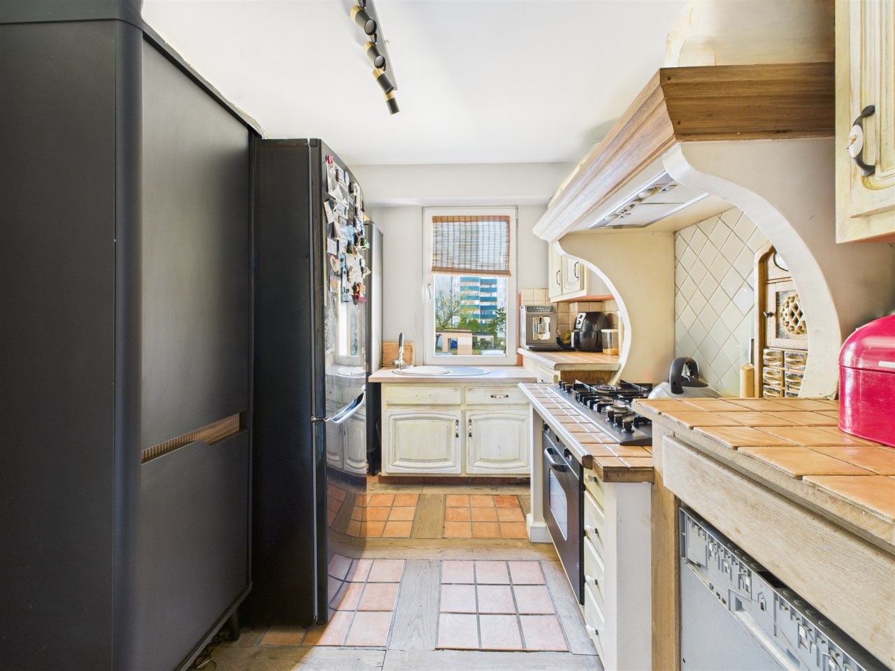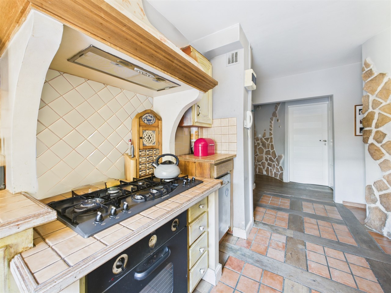 Kuchnia z duszą: To jedyne pomieszczenie bez drzwi, płynnie łączące się z korytarzem. Rustykalna zabudowa z drewnianymi szafkami i blatami z terakoty to kwintesencja domowego ciepła. A duża, 6-palnikowa kuchenka gazowa z obudowanym, retro okapem, dopełnia tę przestrzeń.