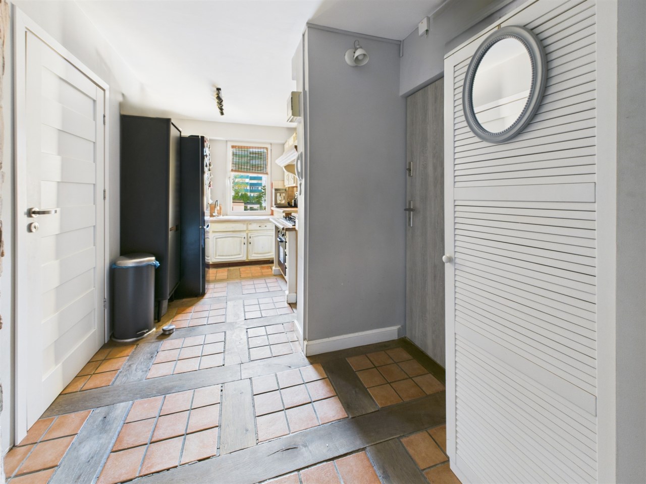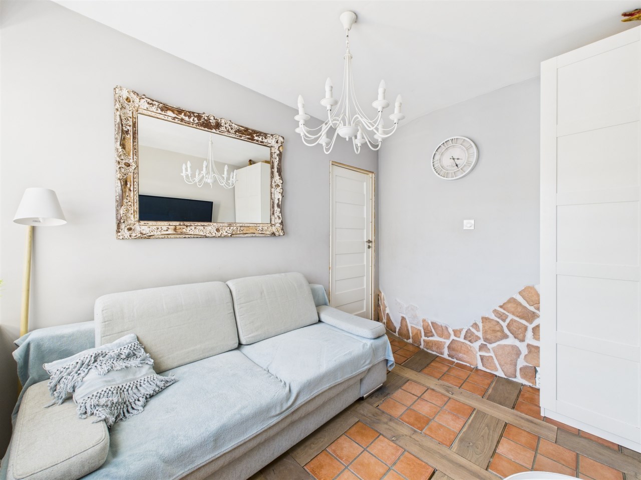Niepowtarzalna podłoga w śródziemnomorskim stylu to prawdziwa gratka! Podłoga w korytarzu, kuchni i saloniku telewizyjnym łączy naturalne deski podłogowe z terakotą ułożoną pomiędzy nimi. To rozwiązanie, choć typowe dla słonecznego Południa, jest niezwykle praktyczne i przytulne, a jednocześnie nadaje wnętrzu unikatowy charakter.