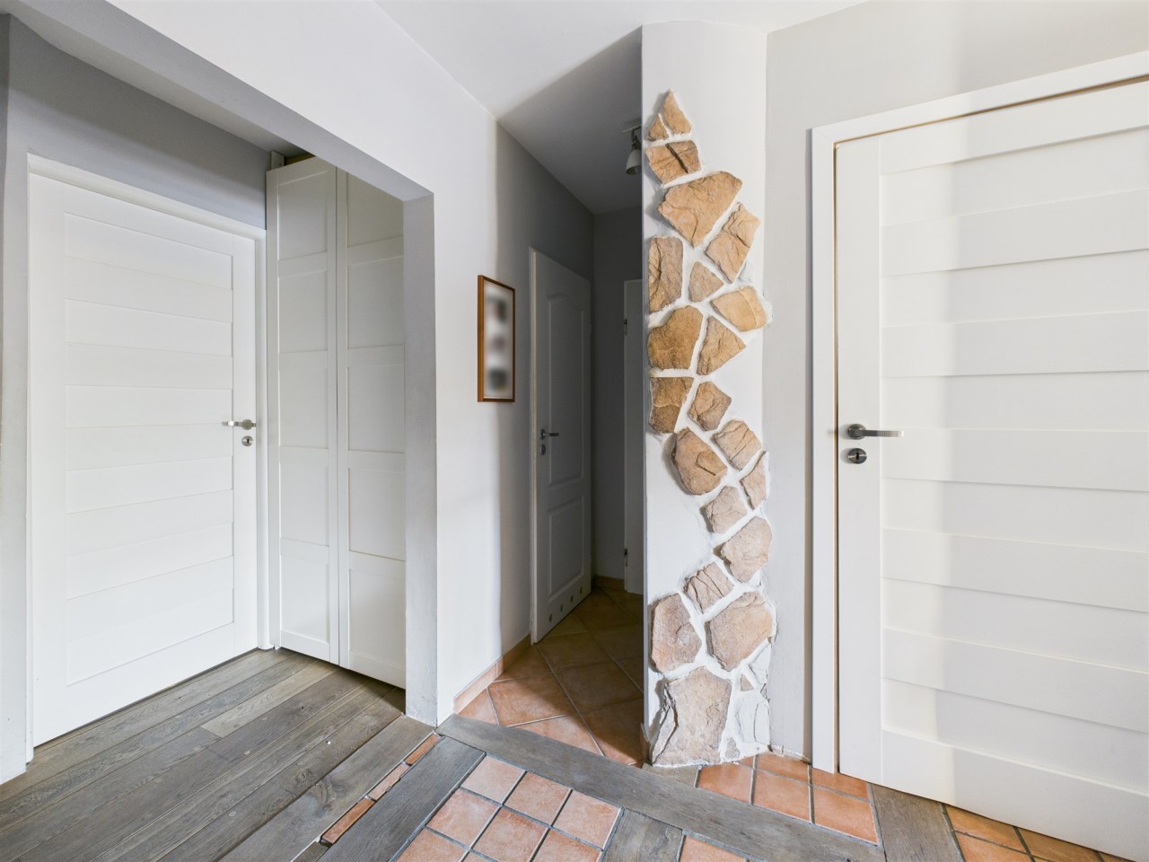 Po wejściu poczujesz klimat, który natychmiast Cię otuli. Przestronny hol zdobią ściany częściowo wykończone kamieniem,