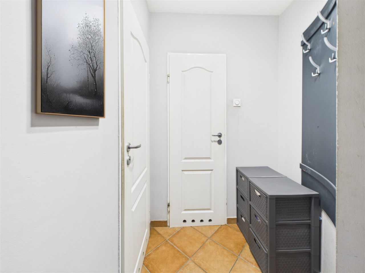 Dzięki indywidualnemu projektowi i zaokrąglonym ścianom korytarza, przestrzeń została optymalnie wykorzystana, zyskując na funkcjonalności.