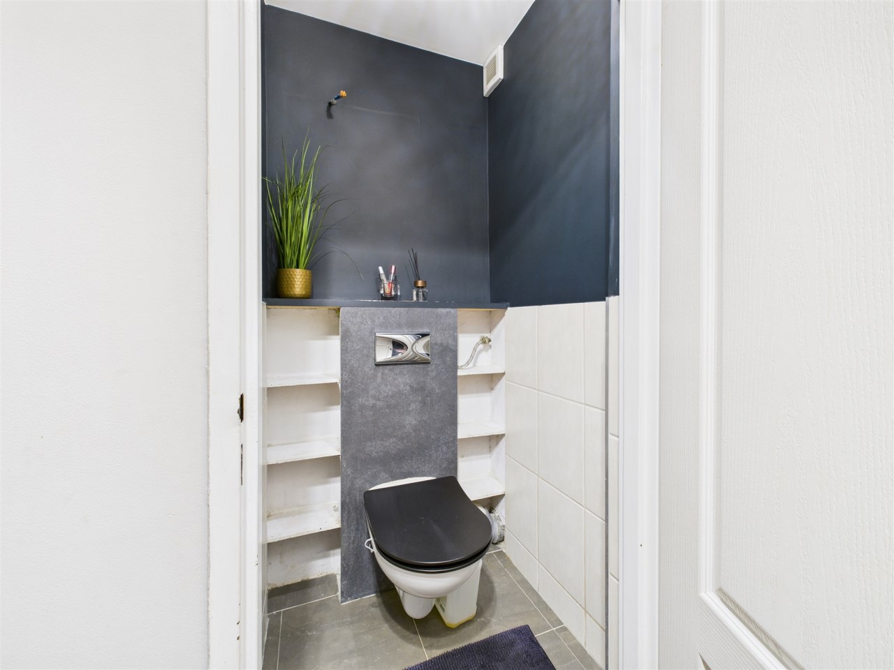 W łazience, dzięki sprytnemu projektowi, udało się wygospodarować dodatkową przestrzeń na wygodny prysznic oraz osobną toaletę – rozwiązanie, które doceni każda rodzina.