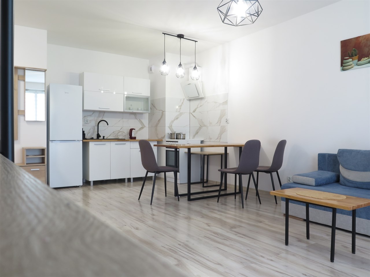 W sypialni znajduje się łóżko małżeńskie, w salonie rozkładana kanapa.