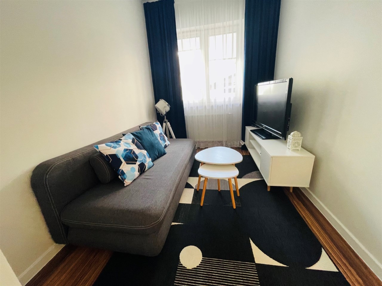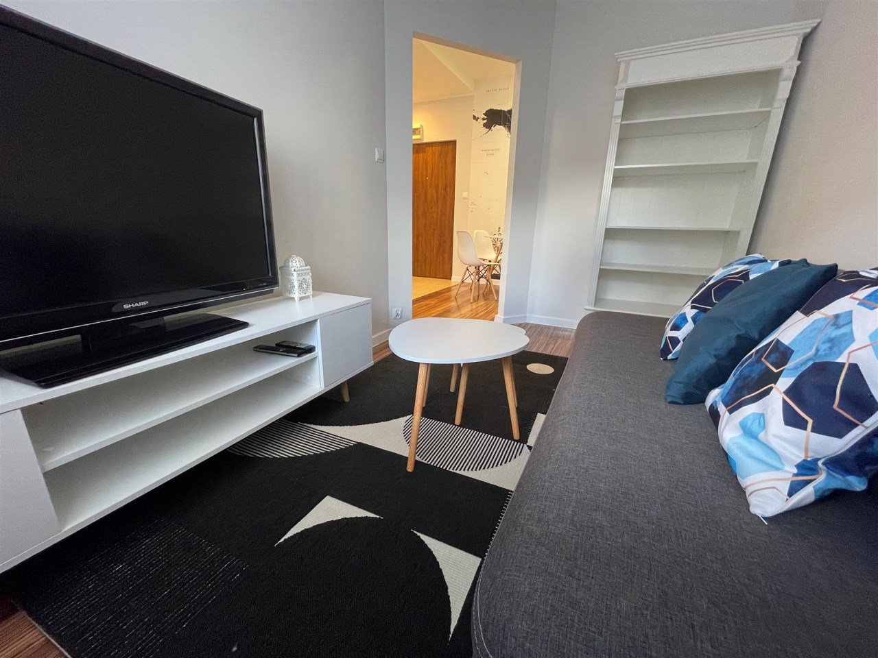 Salonik TV: Przytulny salon z wygodnymi meblami i telewizorem, idealny na wieczorne seanse filmowe i relaks.(Kanapa dwuosobowa, rozkładana dla ewentualnych gości)