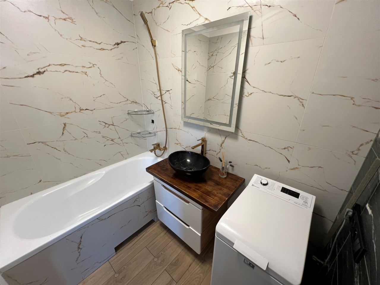 W łazience znajduje się wanna i pralka, w kuchni zabudowa oraz sprzęty AGD. Pokoje również gotowe są do zamieszkania.